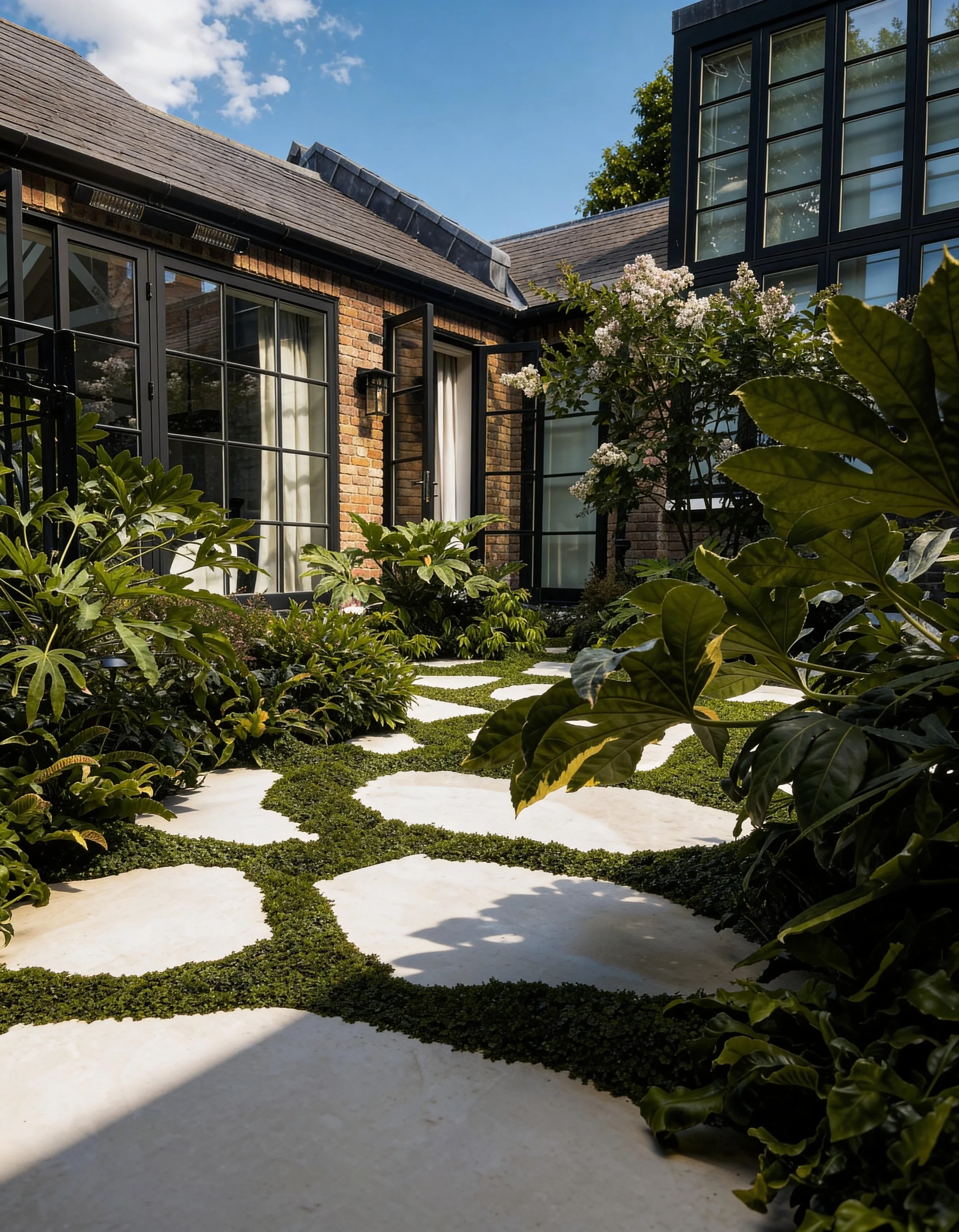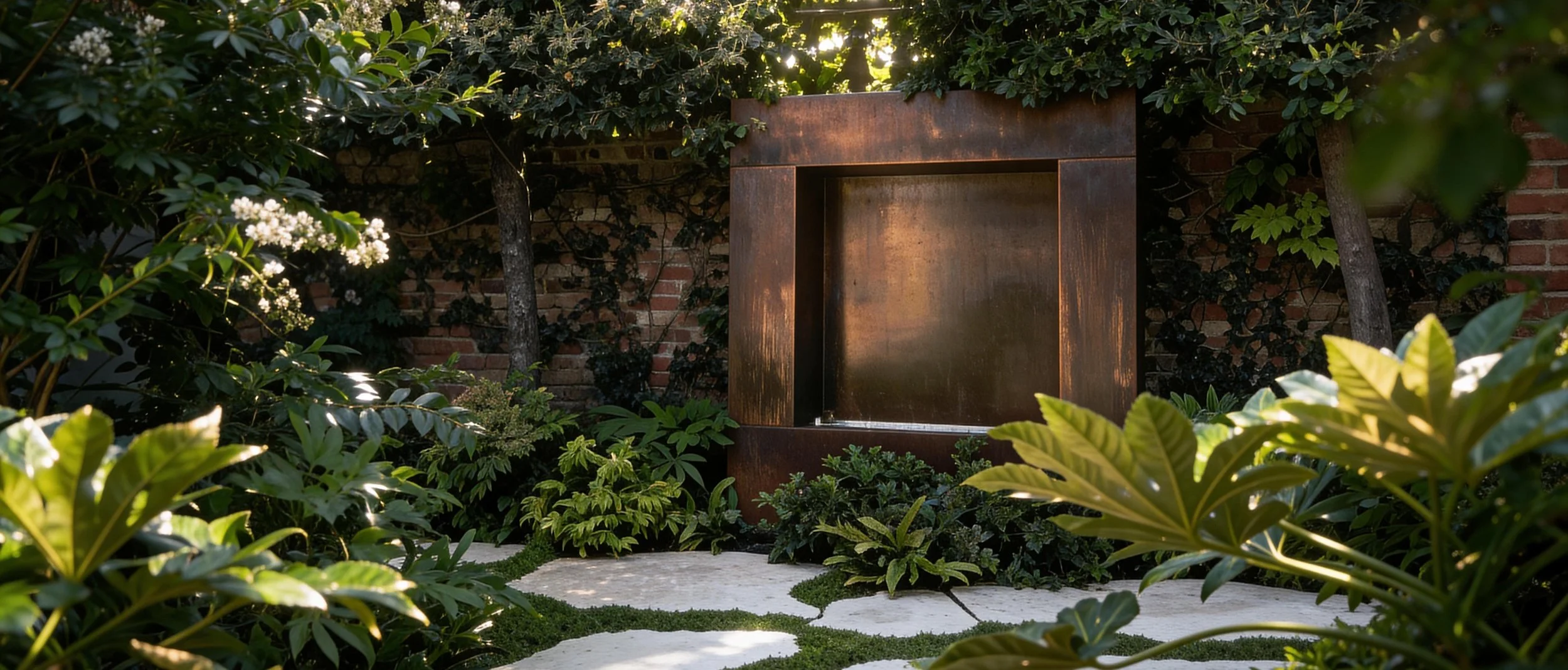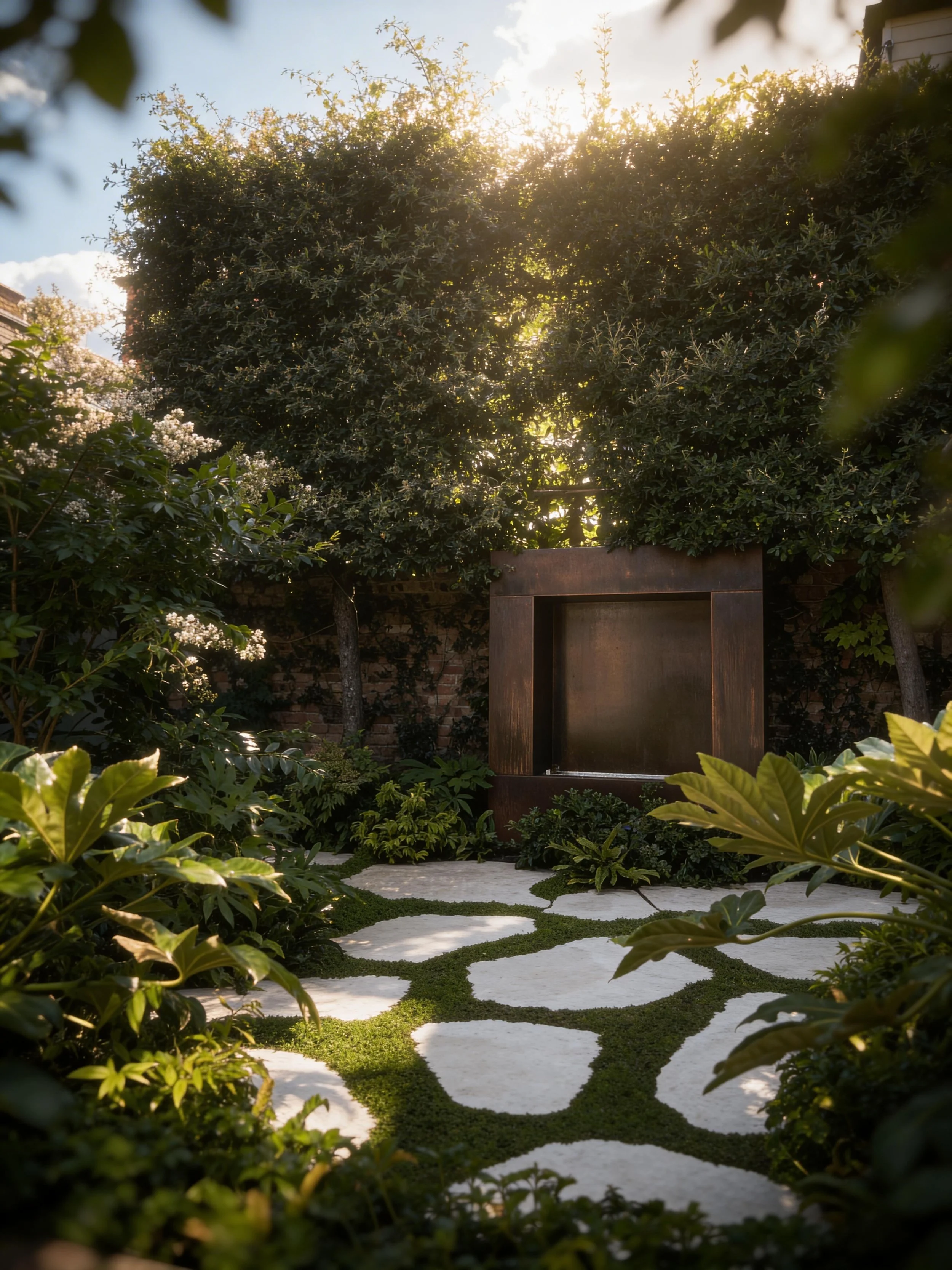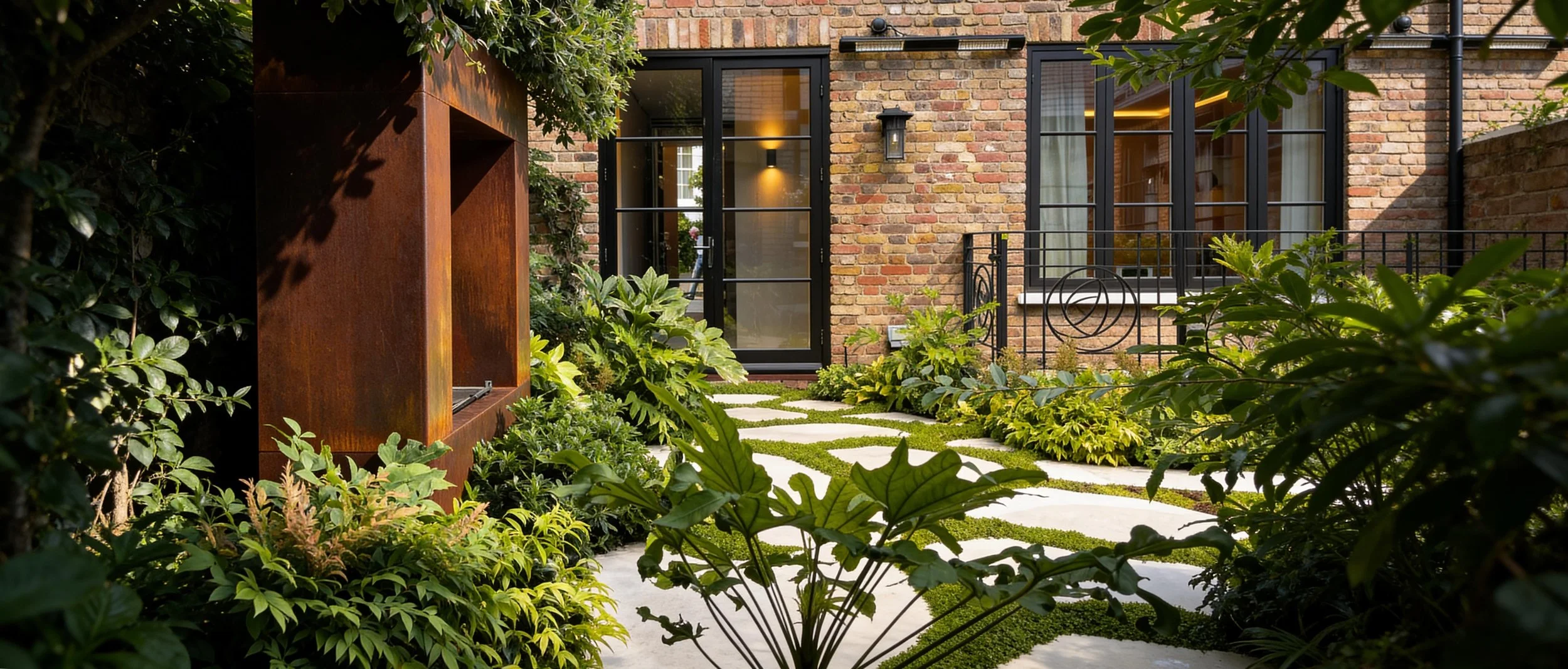 This compact courtyard garden creates a calm green space at the centre of the house. Patterned stone paving is set within low groundcover, softening the geometry and introducing subtle movement across the courtyard. Lush planting surrounds the space, with evergreen shrubs and architectural foliage forming a dense, sheltered garden atmosphere. A corten steel water feature set against the boundary wall provides a quiet focal point.