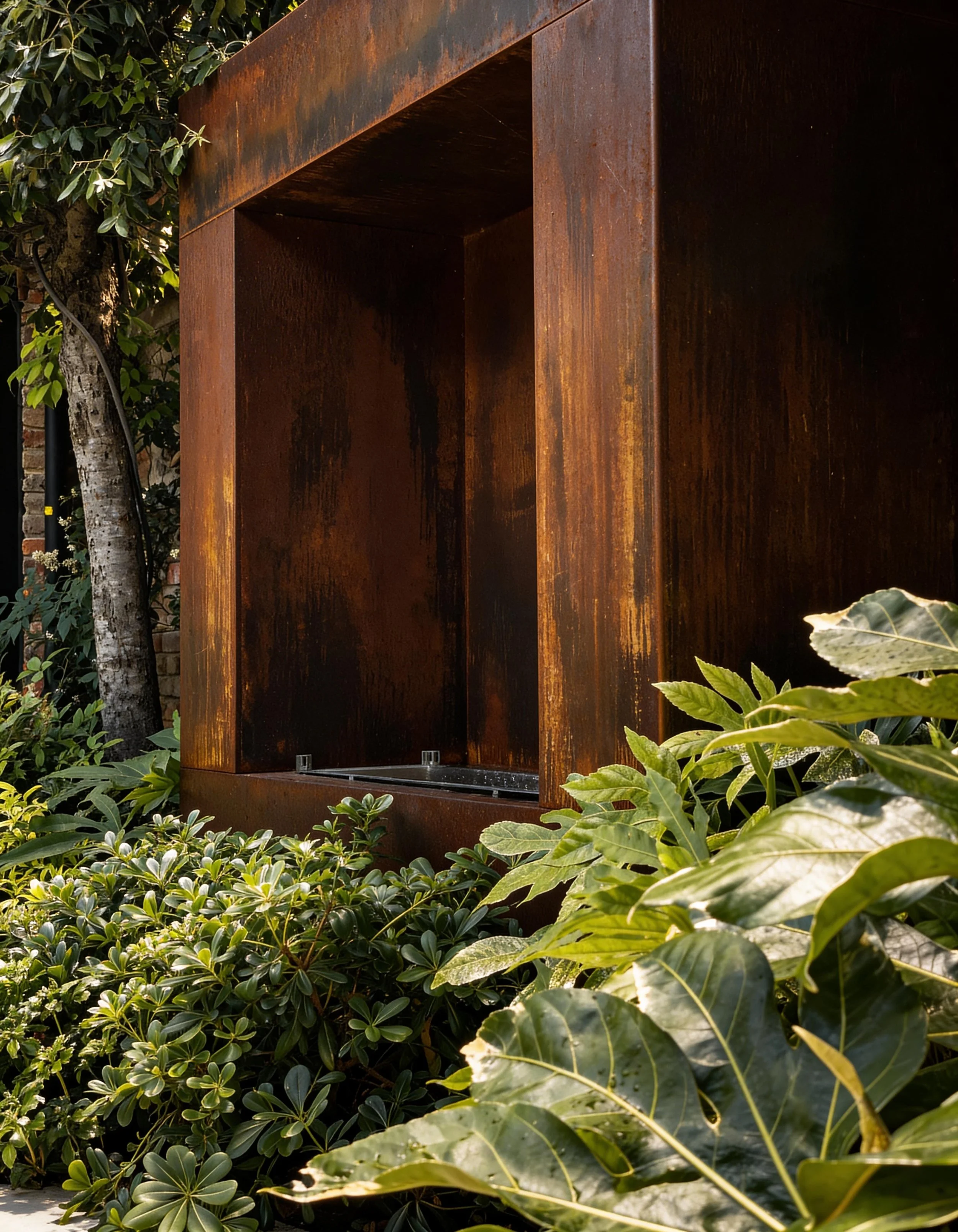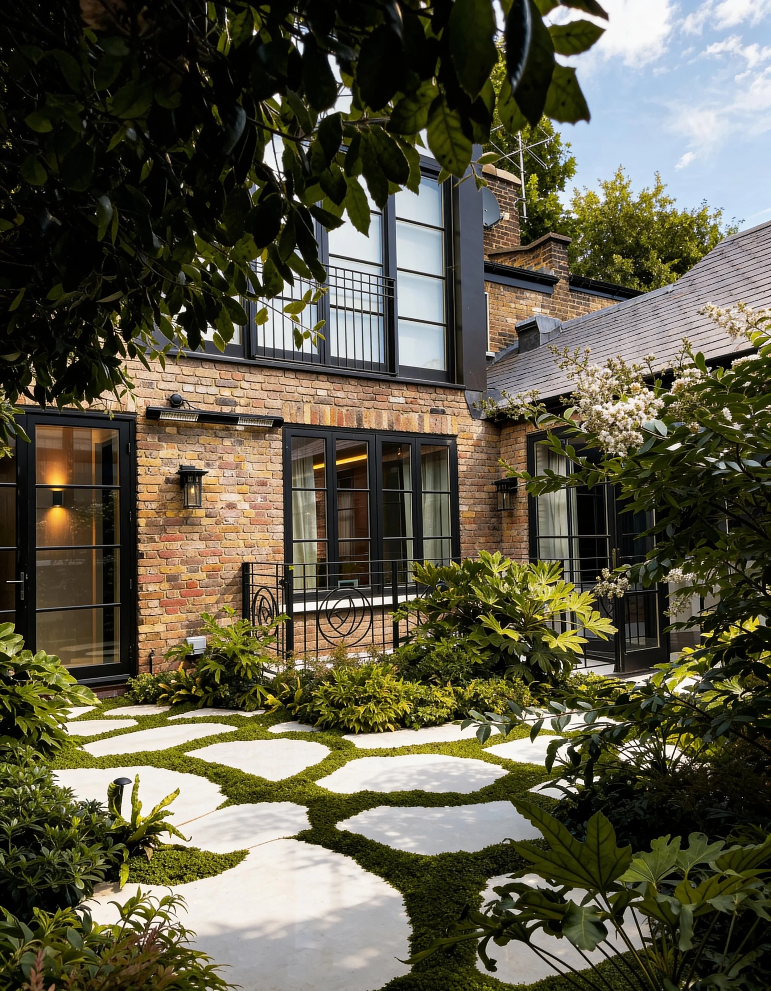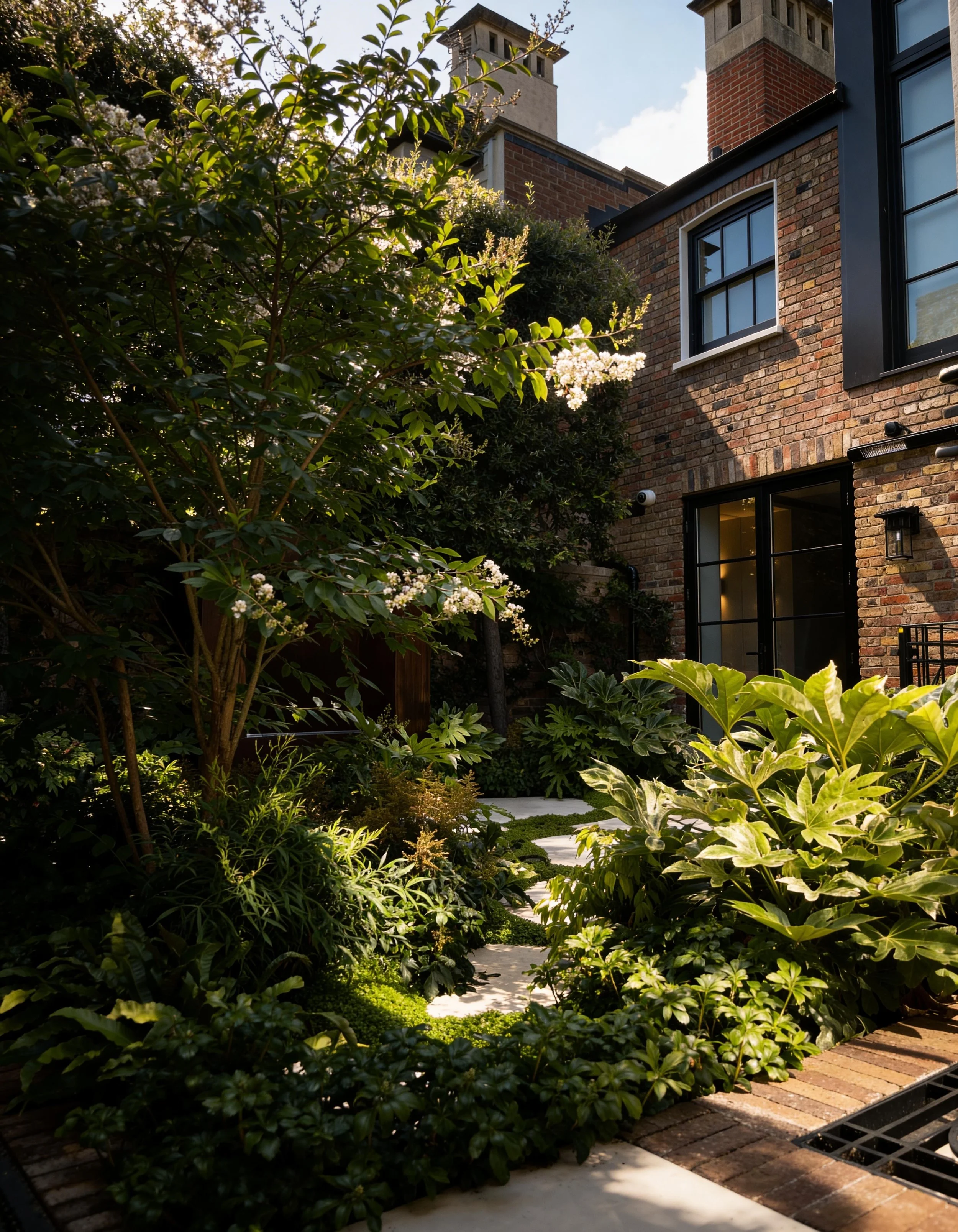 This compact courtyard garden creates a calm green space at the centre of the house. Patterned stone paving is set within low groundcover, softening the geometry and introducing subtle movement across the courtyard. Lush planting surrounds the space, with evergreen shrubs and architectural foliage forming a dense, sheltered garden atmosphere. A corten steel water feature set against the boundary wall provides a quiet focal point.