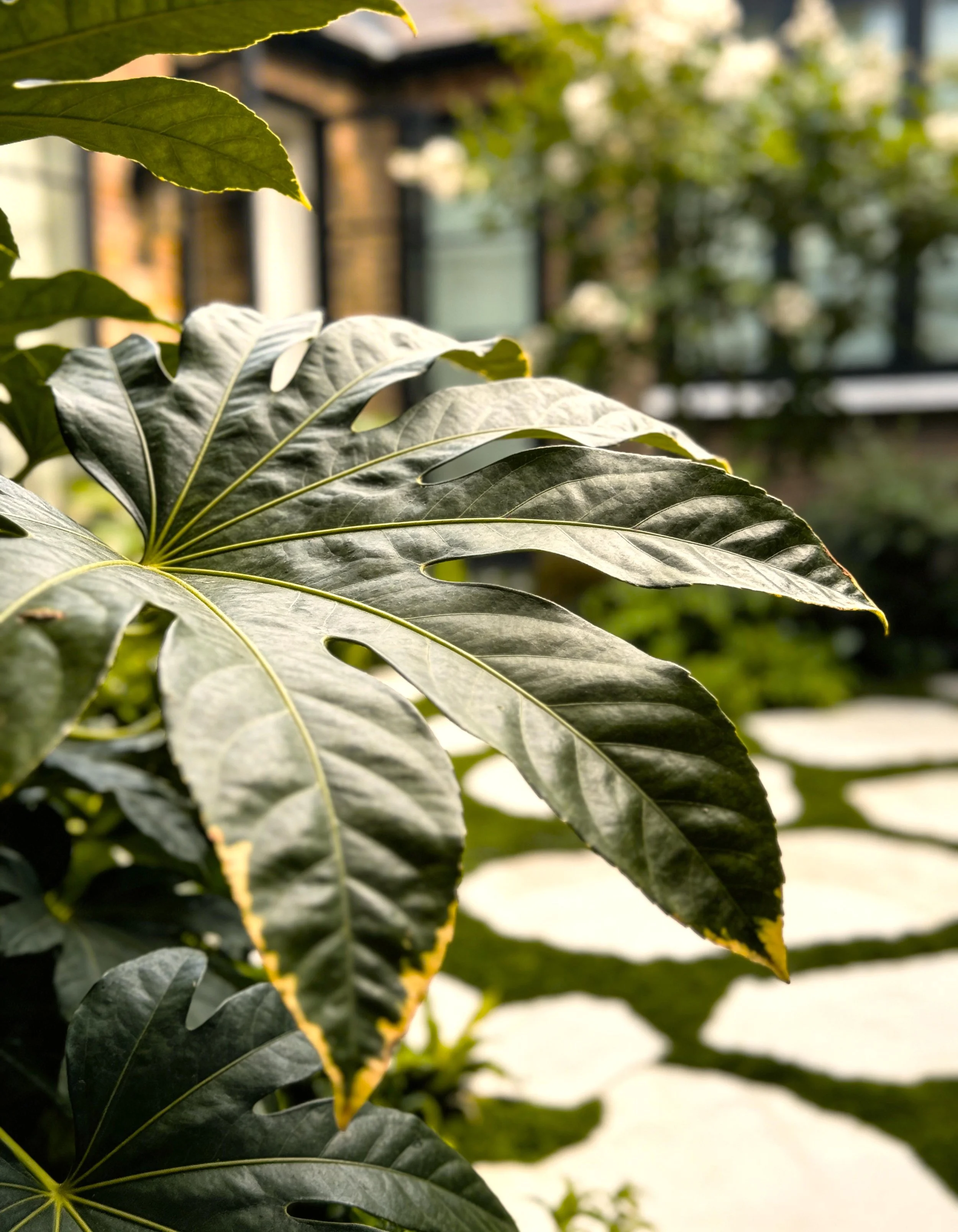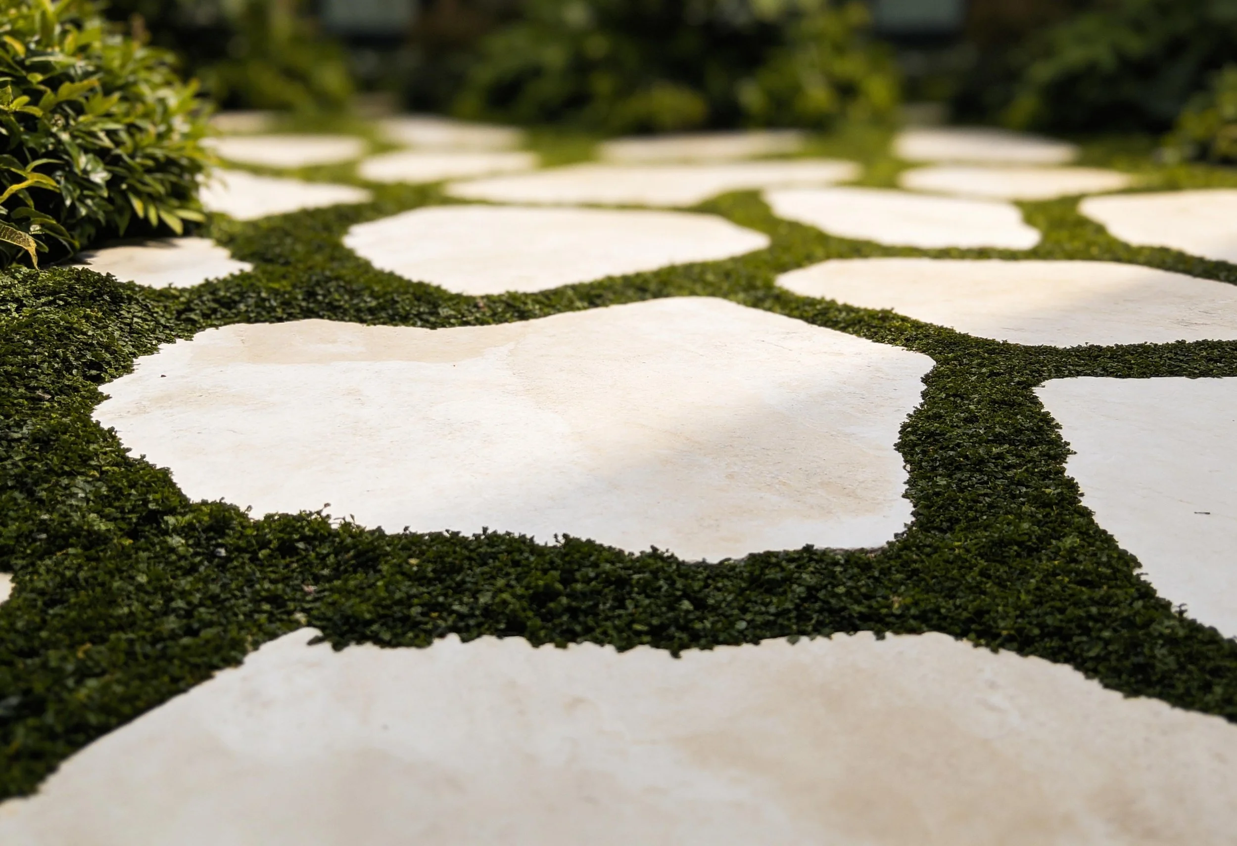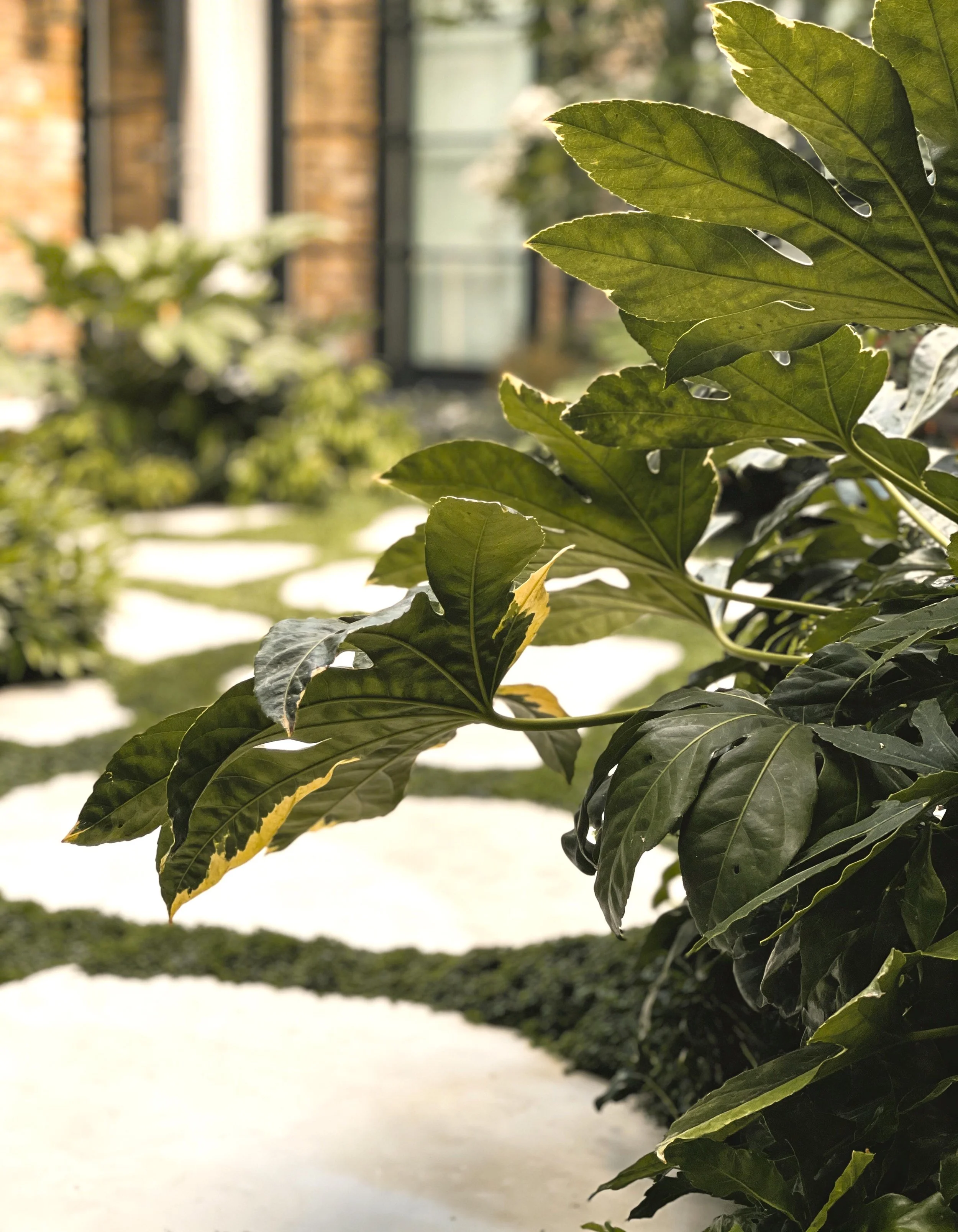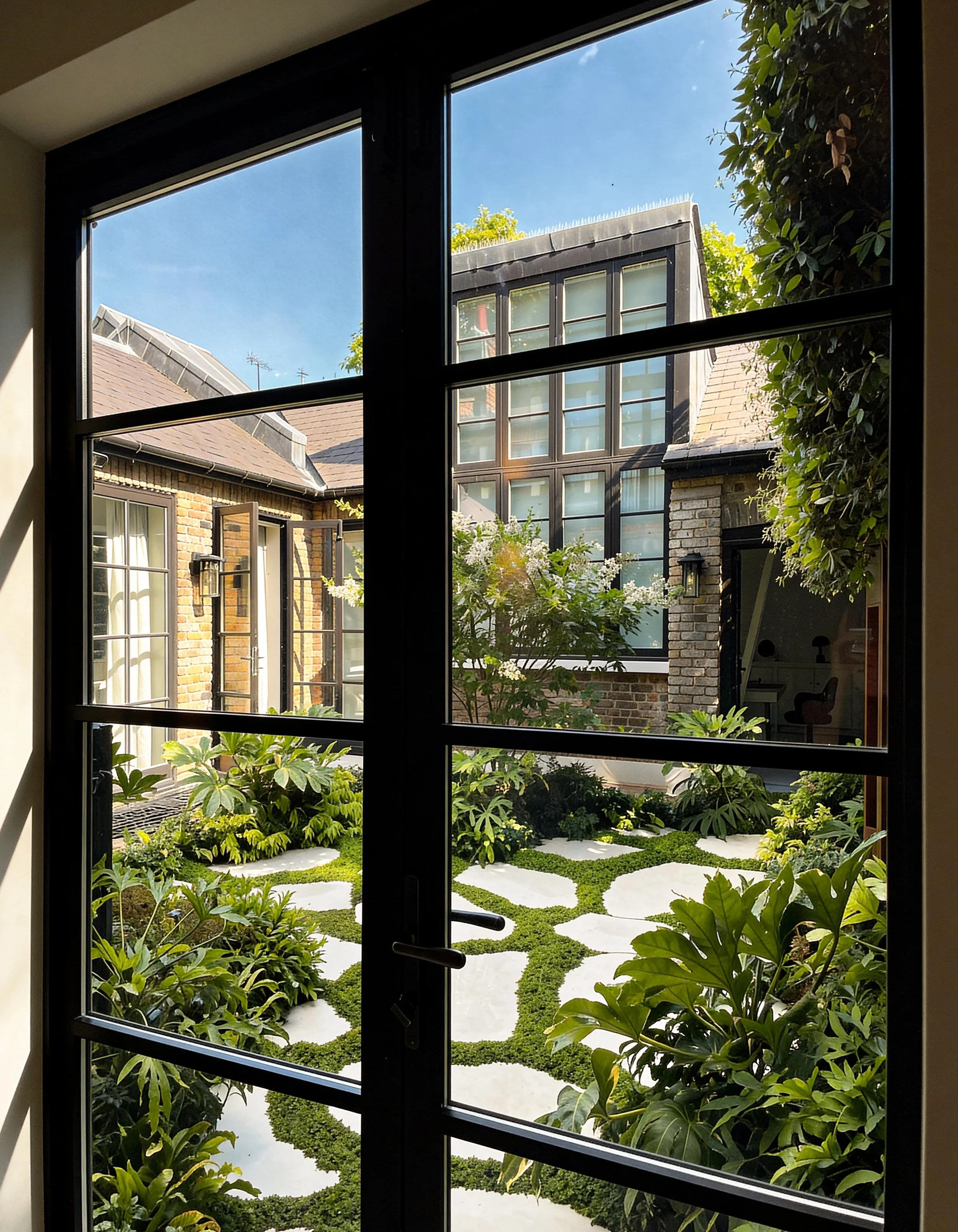 This compact courtyard garden creates a calm green space at the centre of the house. Patterned stone paving is set within low groundcover, softening the geometry and introducing subtle movement across the courtyard. Lush planting surrounds the space, with evergreen shrubs and architectural foliage forming a dense, sheltered garden atmosphere. A corten steel water feature set against the boundary wall provides a quiet focal point.