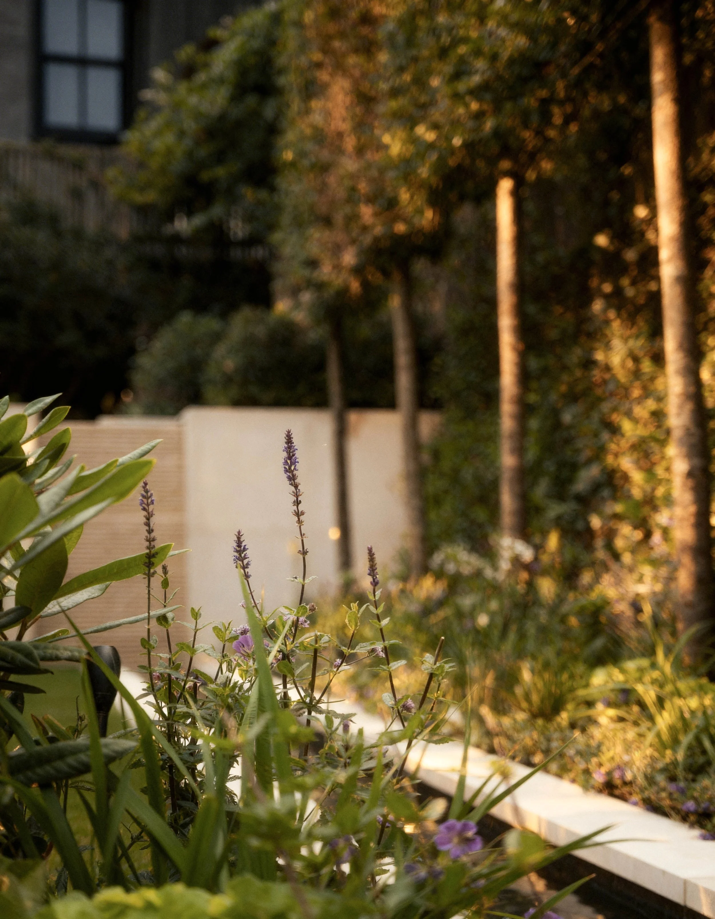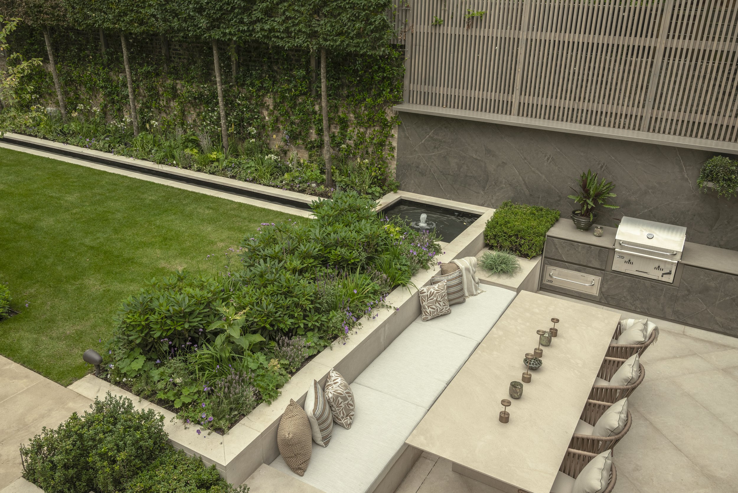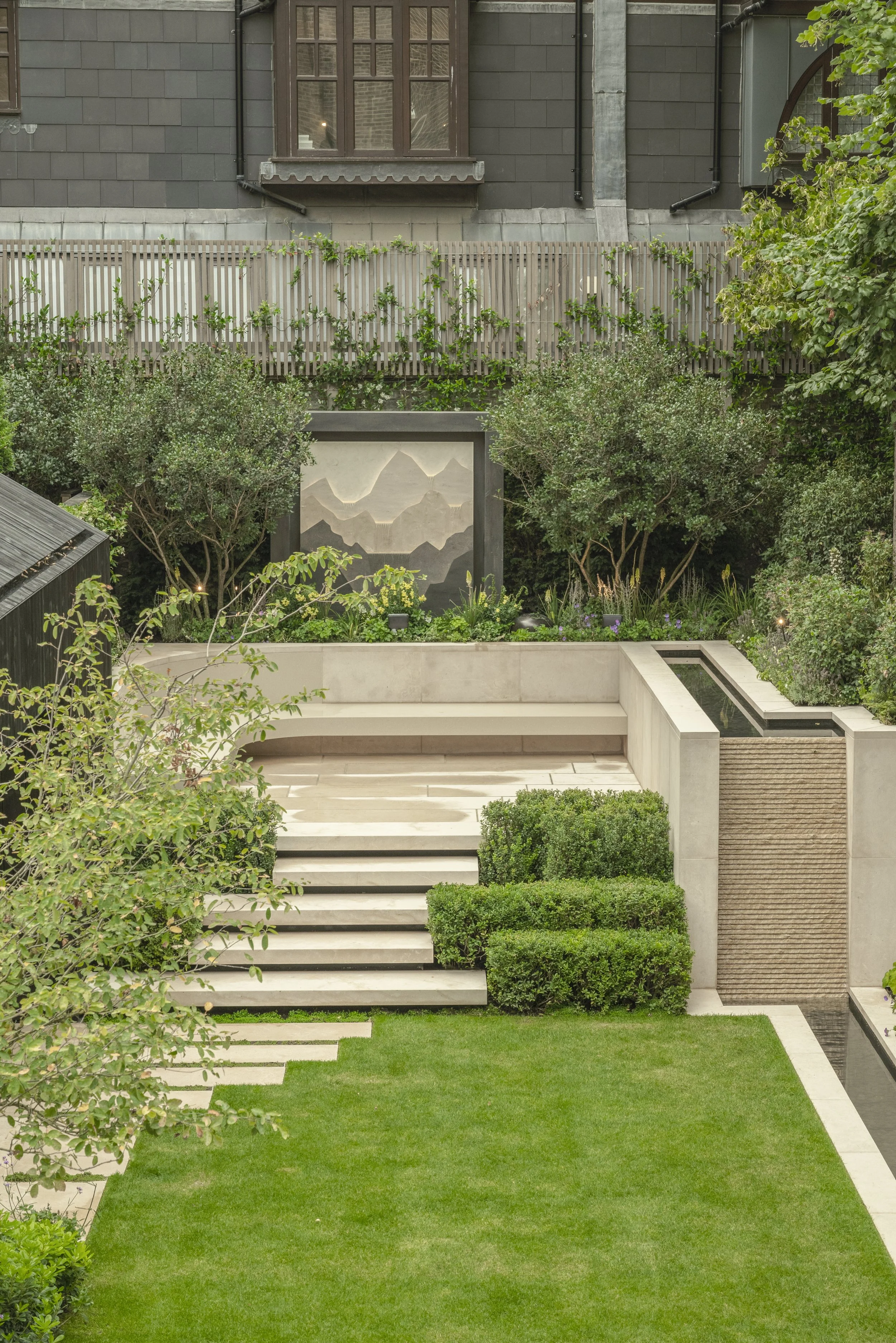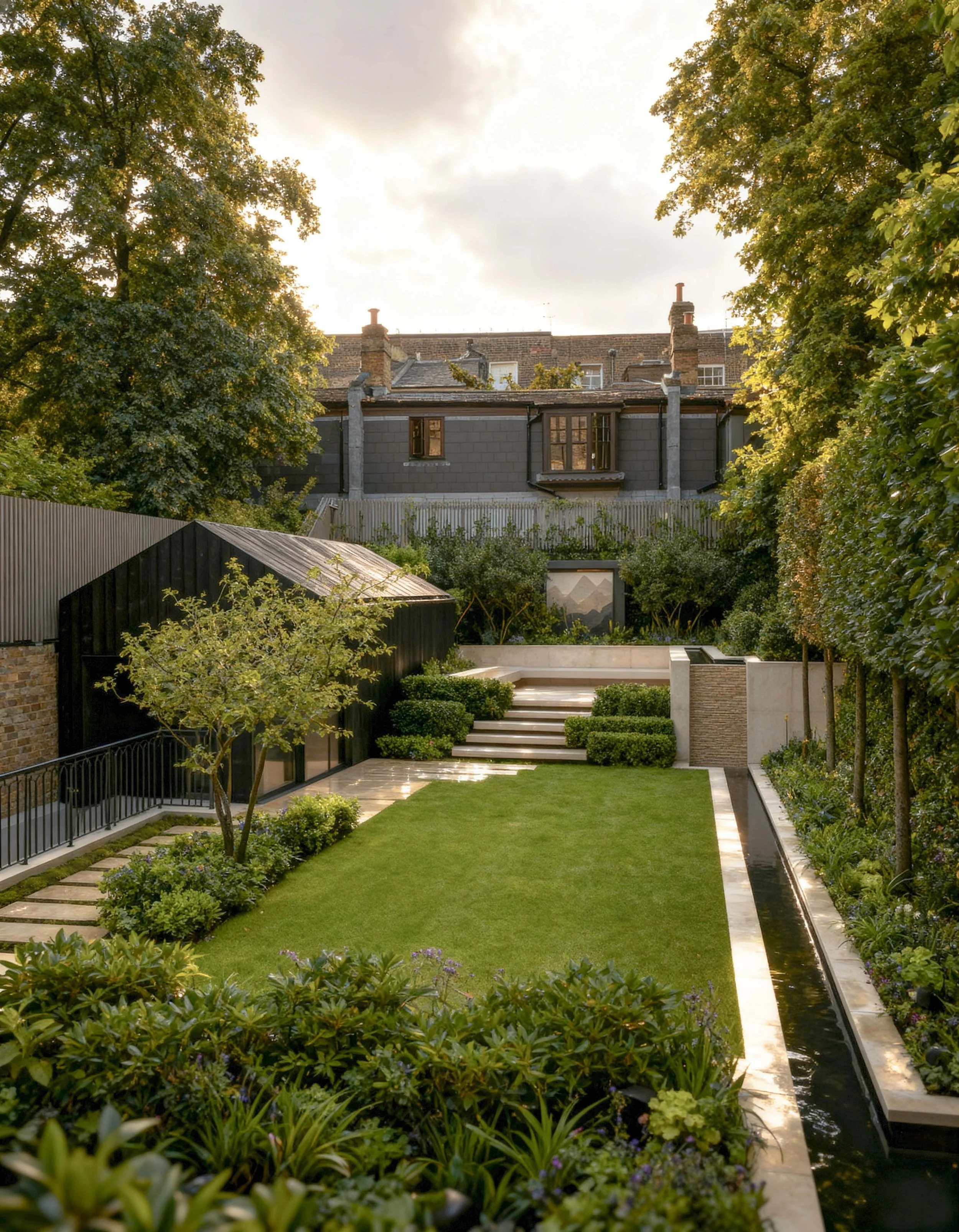 A clear axis organises the garden, creating a simple and balanced spatial structure. A generous lawn sits at the centre, framed by layered planting and clipped hedging that provide a calm green backdrop. A linear water feature runs along one side of the garden, introducing movement and guiding views through the space. Stone terraces form a series of seating and dining areas, stepping gently through the garden and extending the living space outdoors. Boundary planting and pleached trees provide privacy from neighbouring buildings, while lower planting adds texture and seasonal variation throughout the garden.