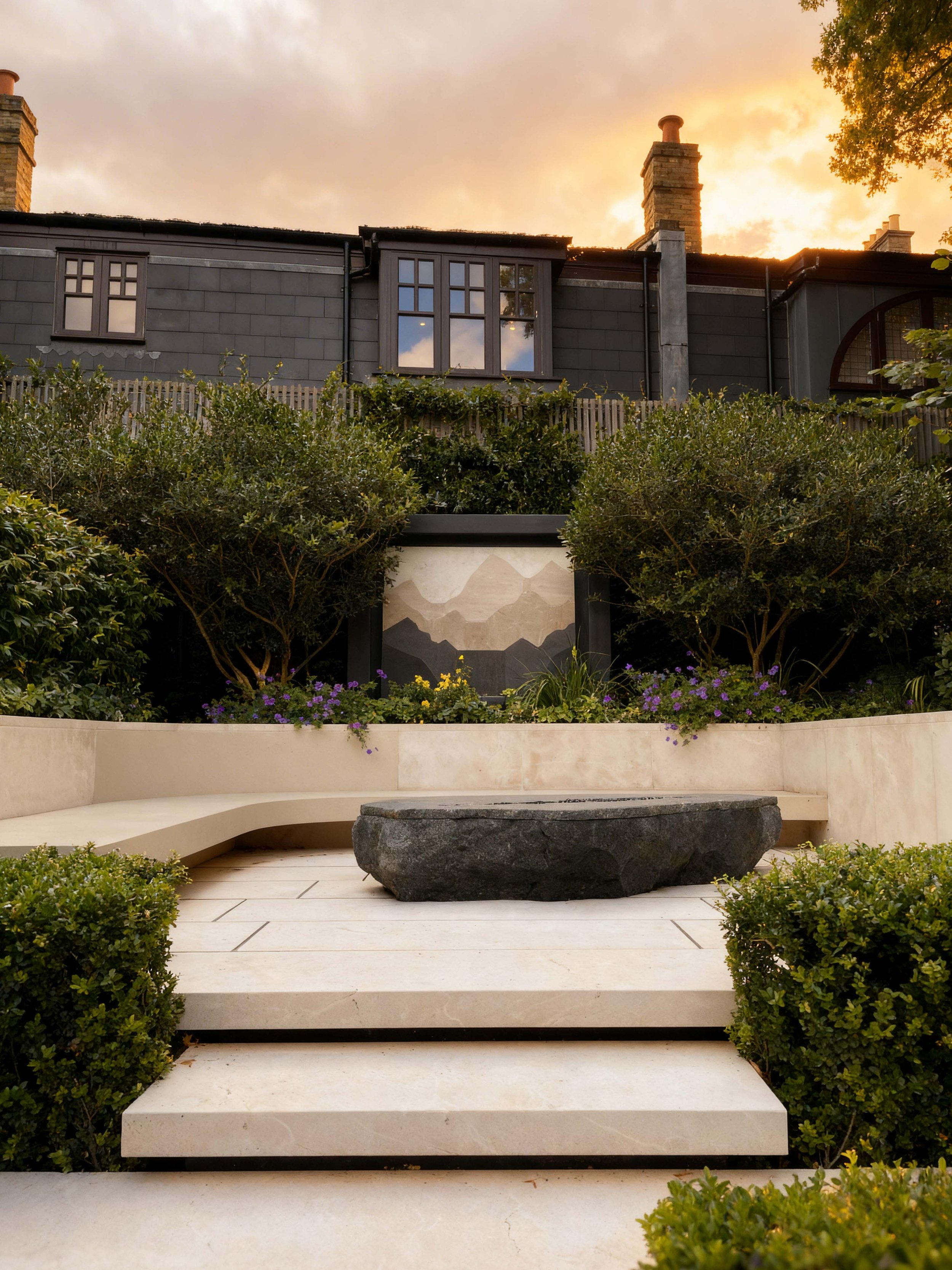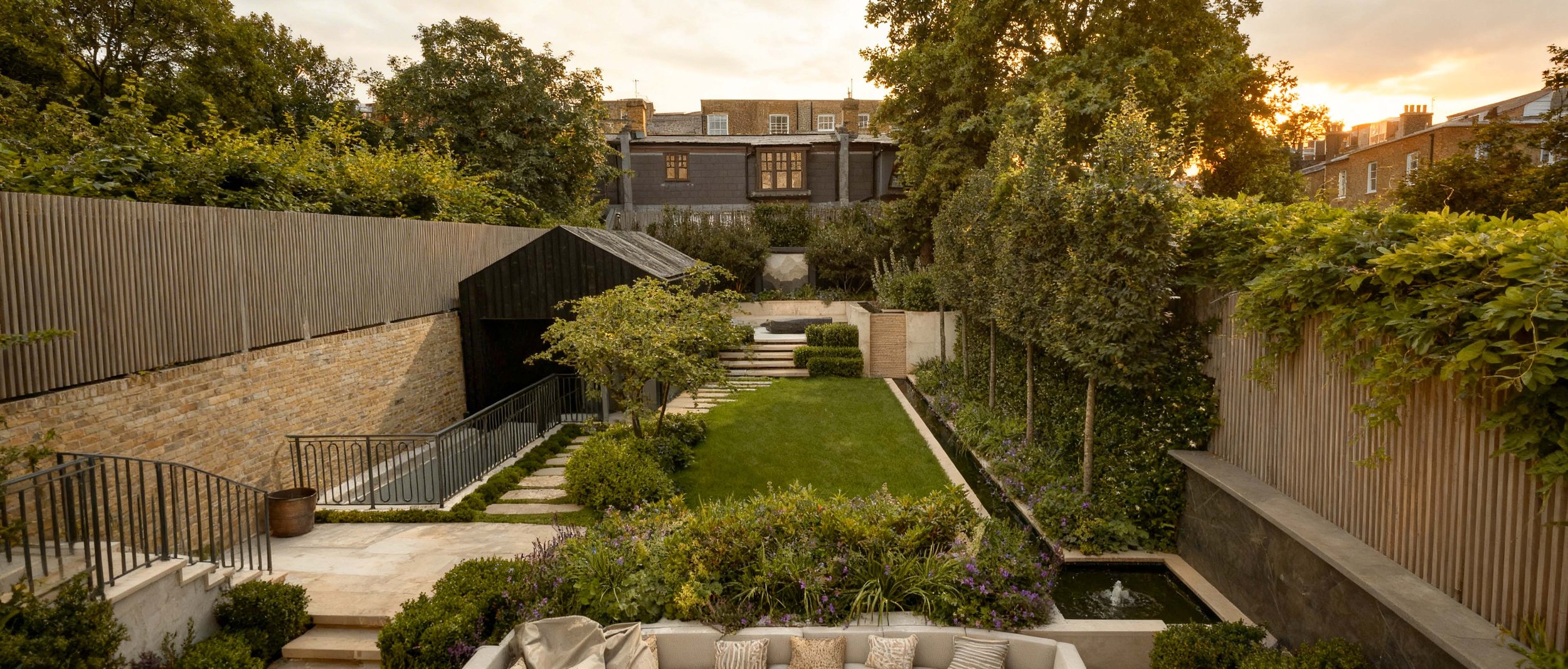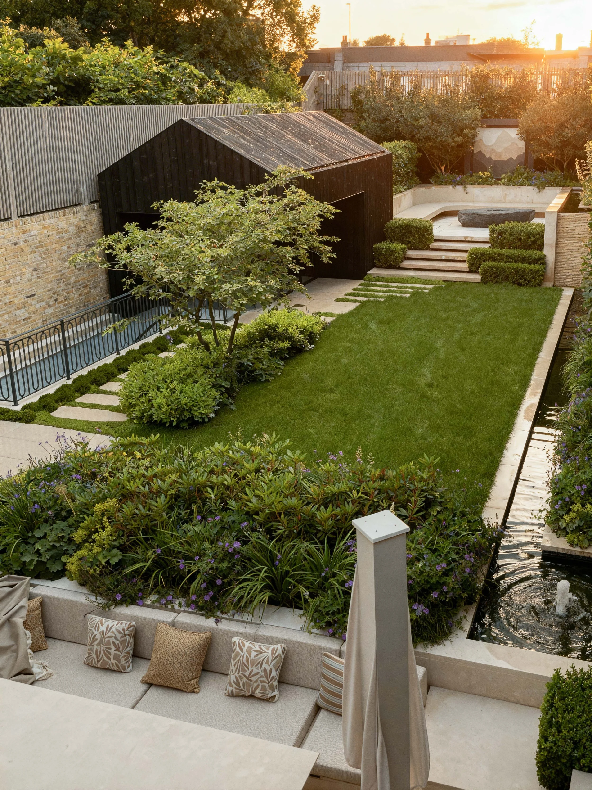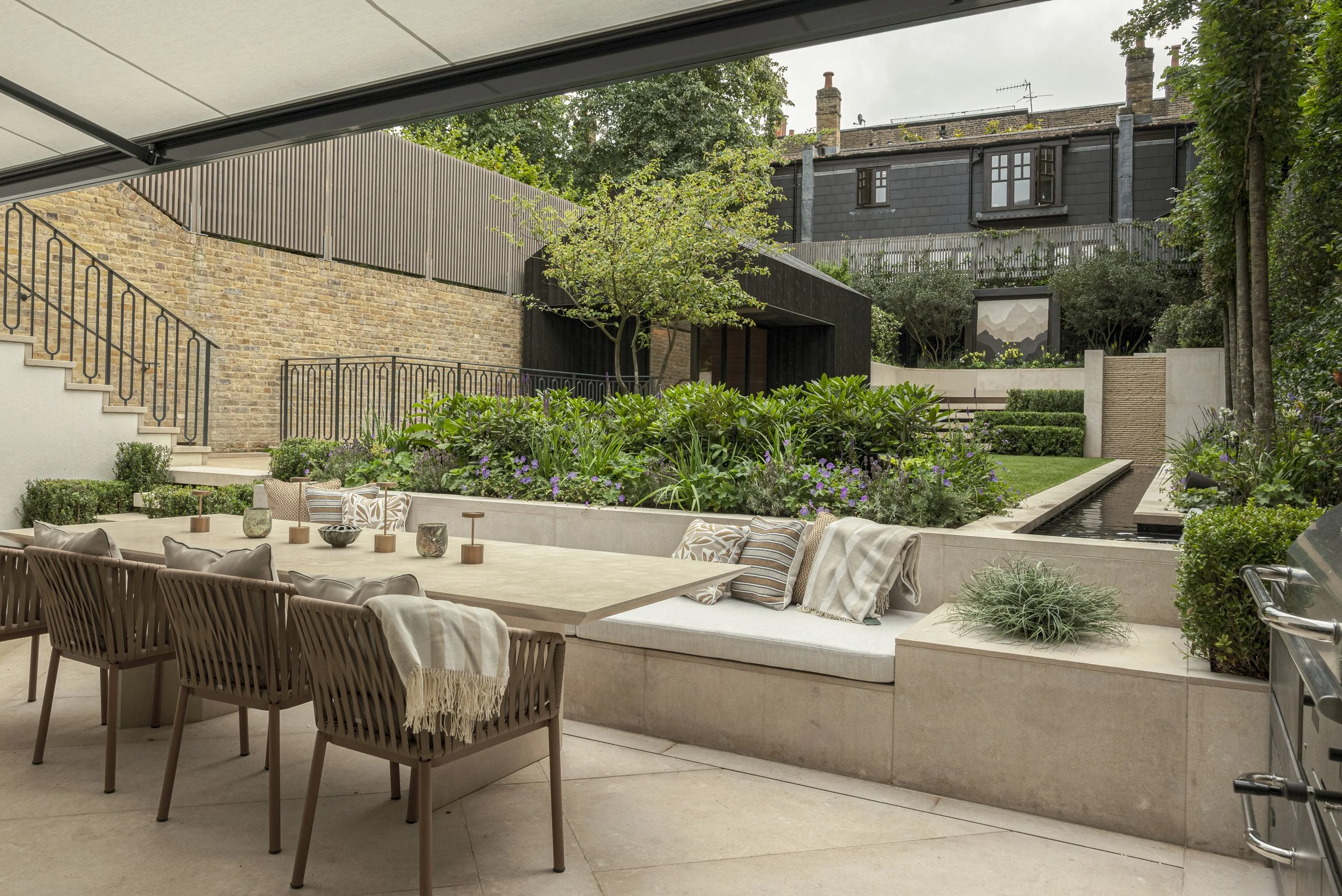 A clear axis organises the garden, creating a simple and balanced spatial structure. A generous lawn sits at the centre, framed by layered planting and clipped hedging that provide a calm green backdrop. A linear water feature runs along one side of the garden, introducing movement and guiding views through the space. Stone terraces form a series of seating and dining areas, stepping gently through the garden and extending the living space outdoors. Boundary planting and pleached trees provide privacy from neighbouring buildings, while lower planting adds texture and seasonal variation throughout the garden.