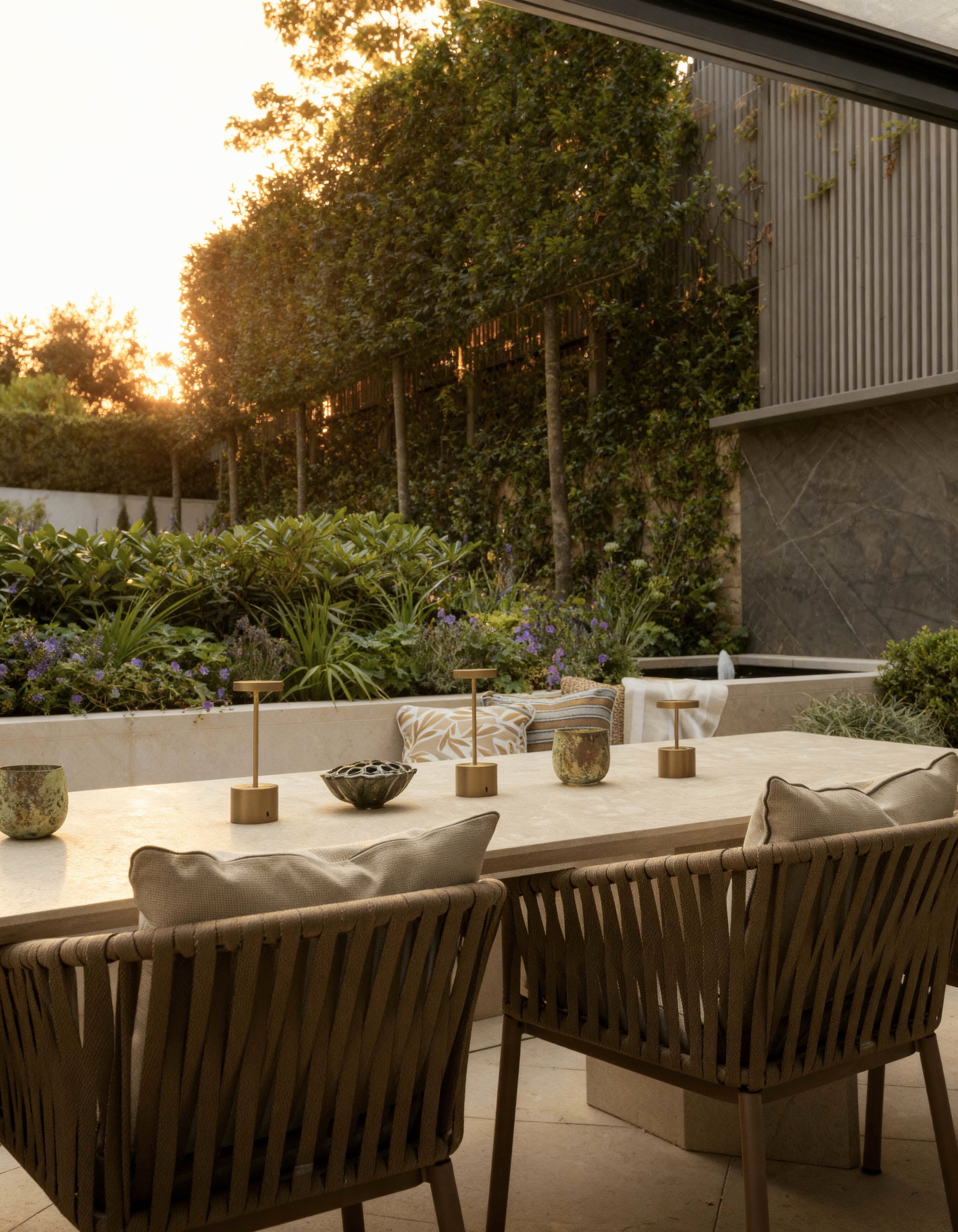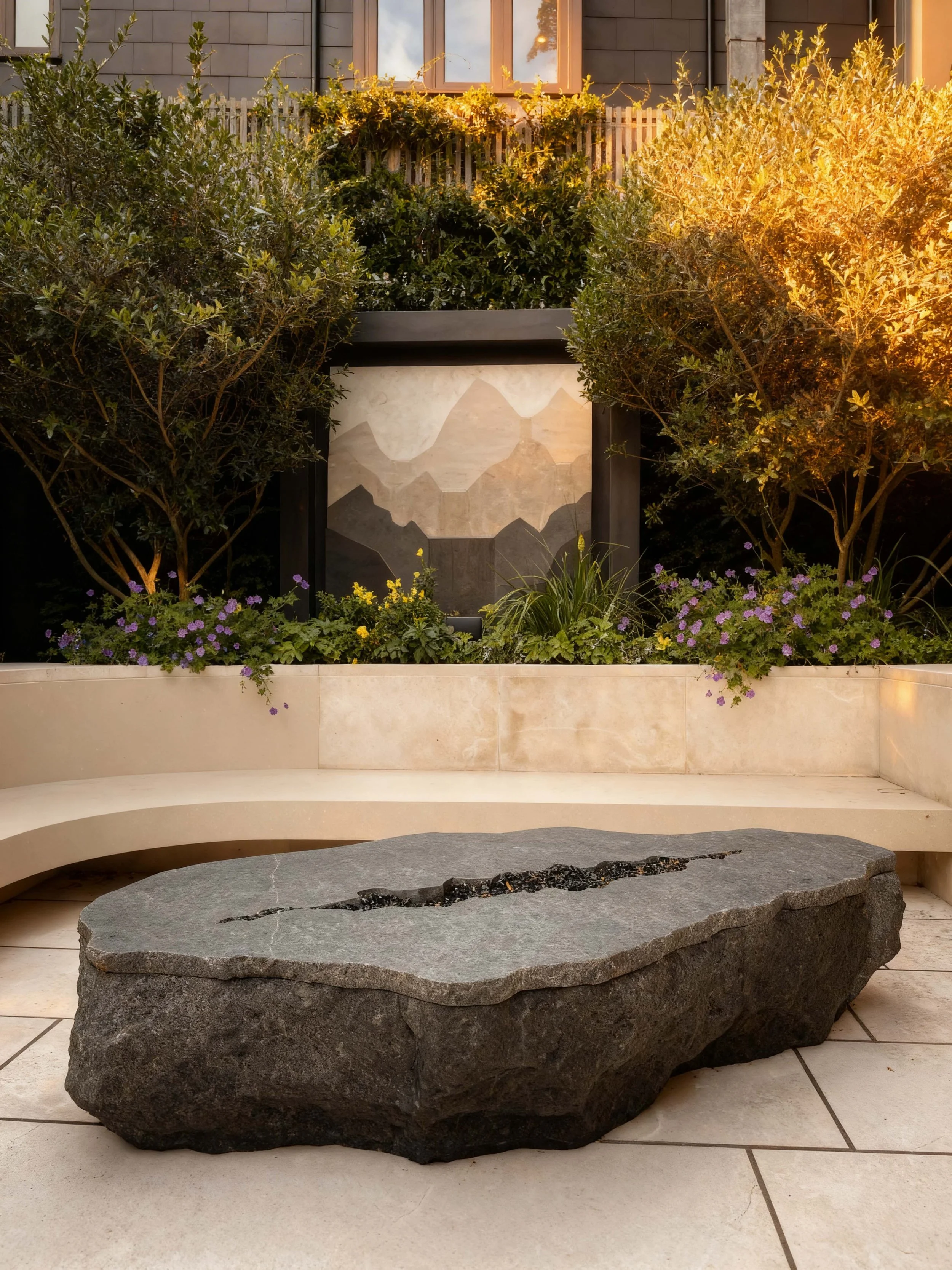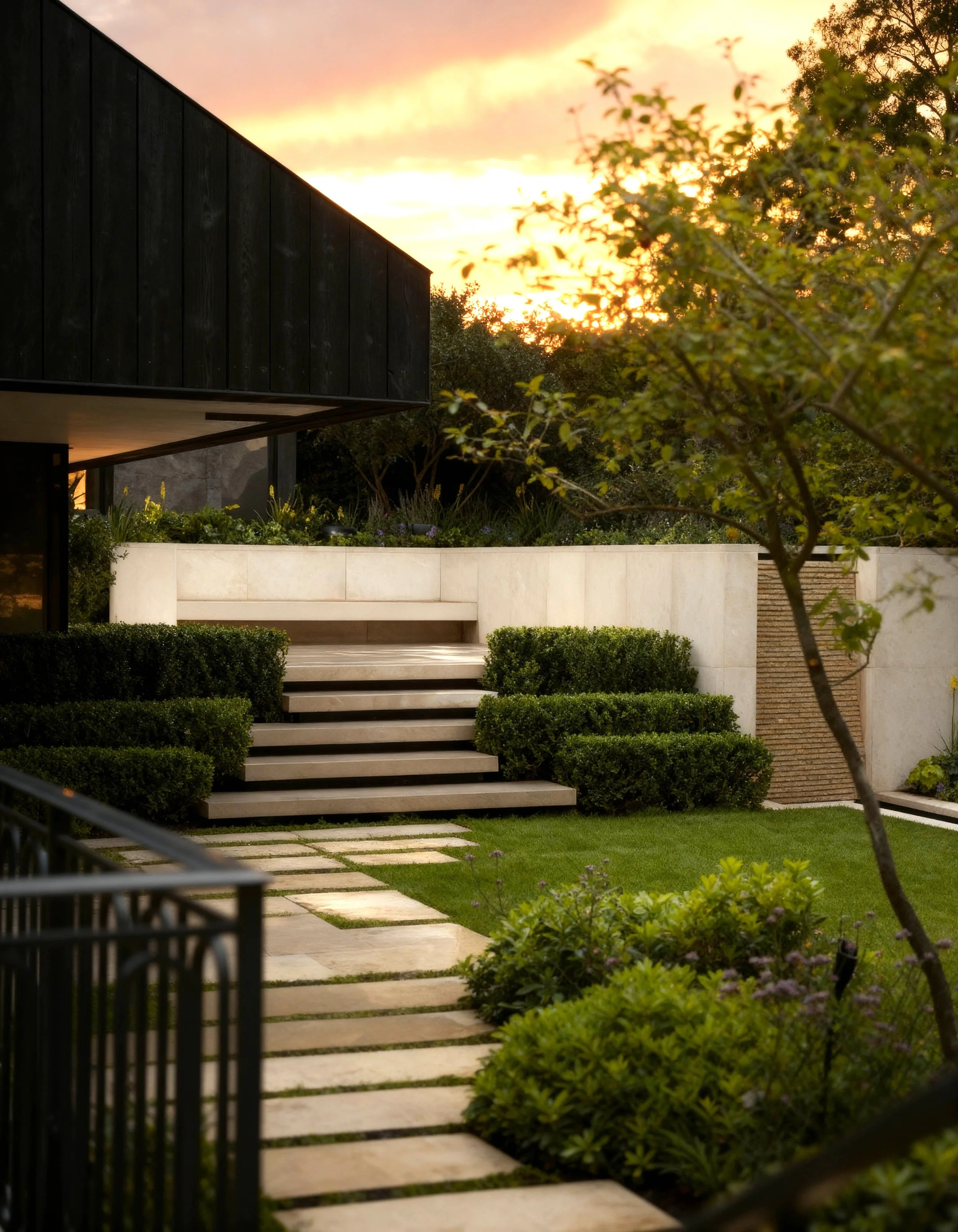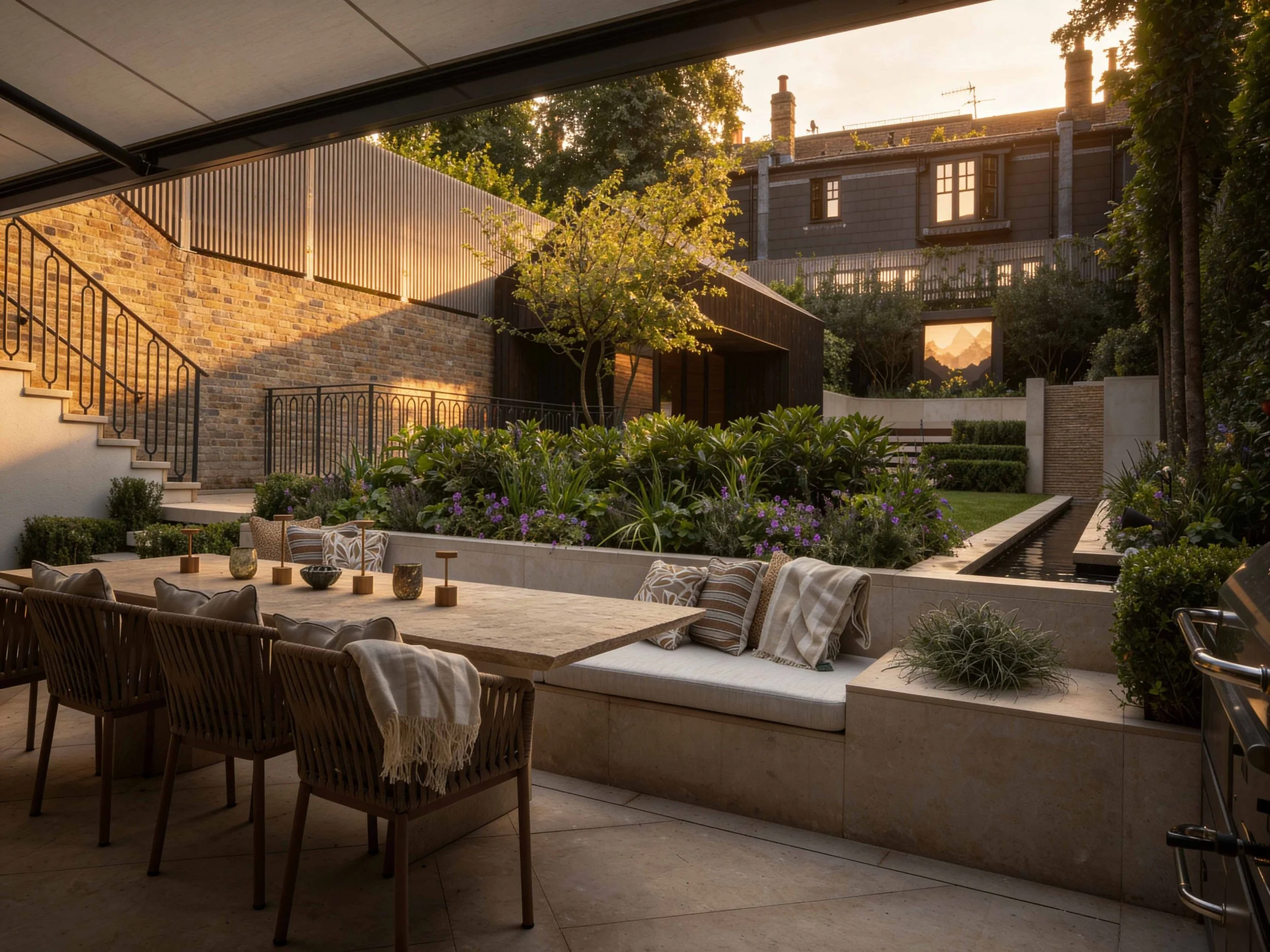 A clear axis organises the garden, creating a simple and balanced spatial structure. A generous lawn sits at the centre, framed by layered planting and clipped hedging that provide a calm green backdrop. A linear water feature runs along one side of the garden, introducing movement and guiding views through the space. Stone terraces form a series of seating and dining areas, stepping gently through the garden and extending the living space outdoors. Boundary planting and pleached trees provide privacy from neighbouring buildings, while lower planting adds texture and seasonal variation throughout the garden.