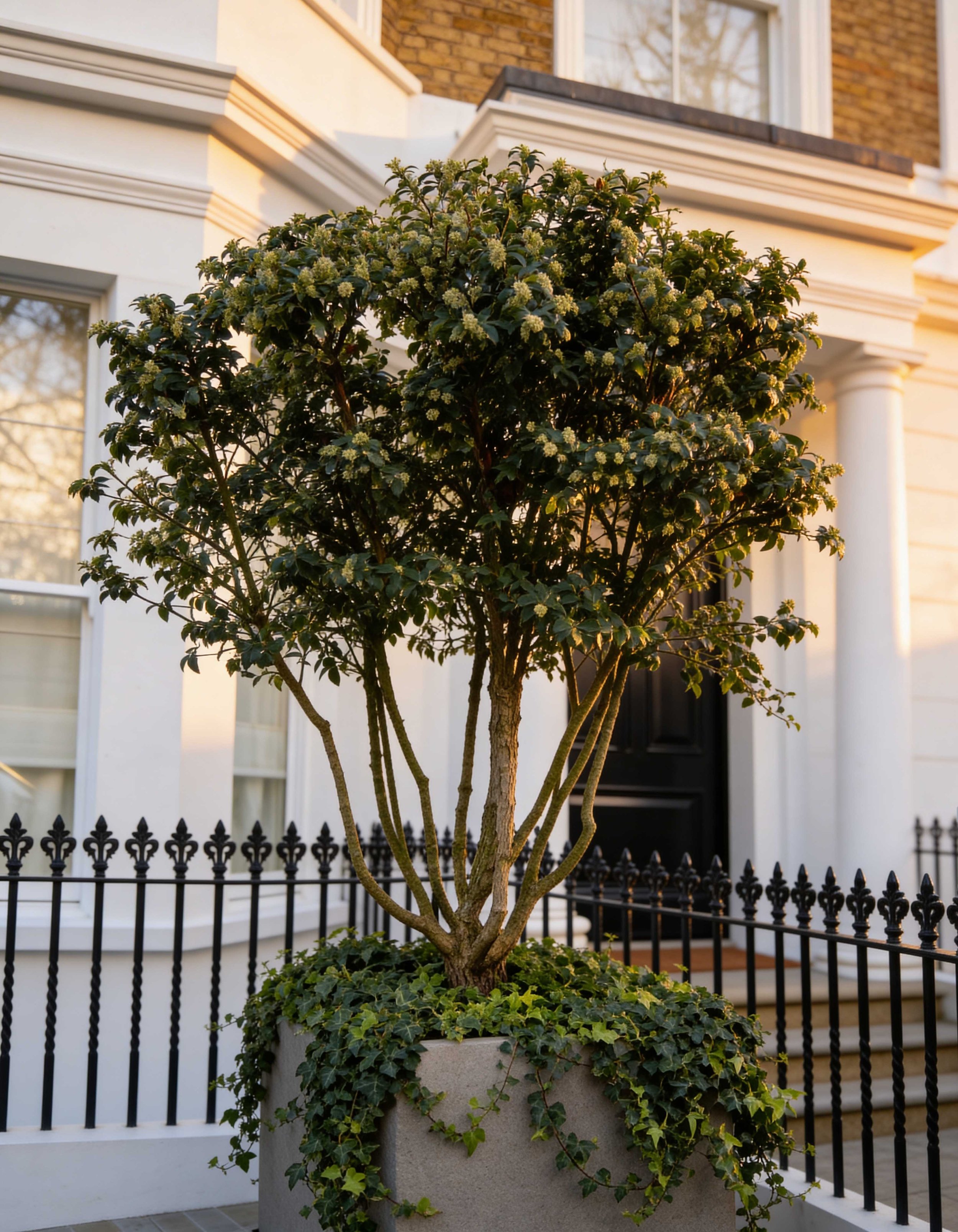Stone paving and bespoke planters introduce a restrained architectural language that complements the surrounding townhouse setting.