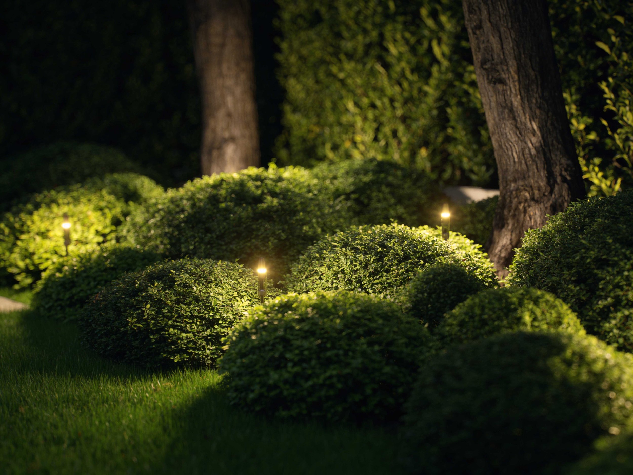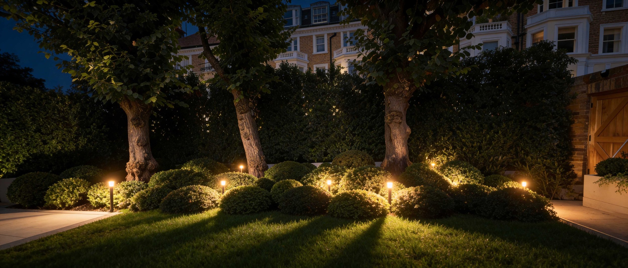 Subtle, low-level lighting weaves through the planting, casting soft shadows and enhancing the texture and depth of the garden at night.