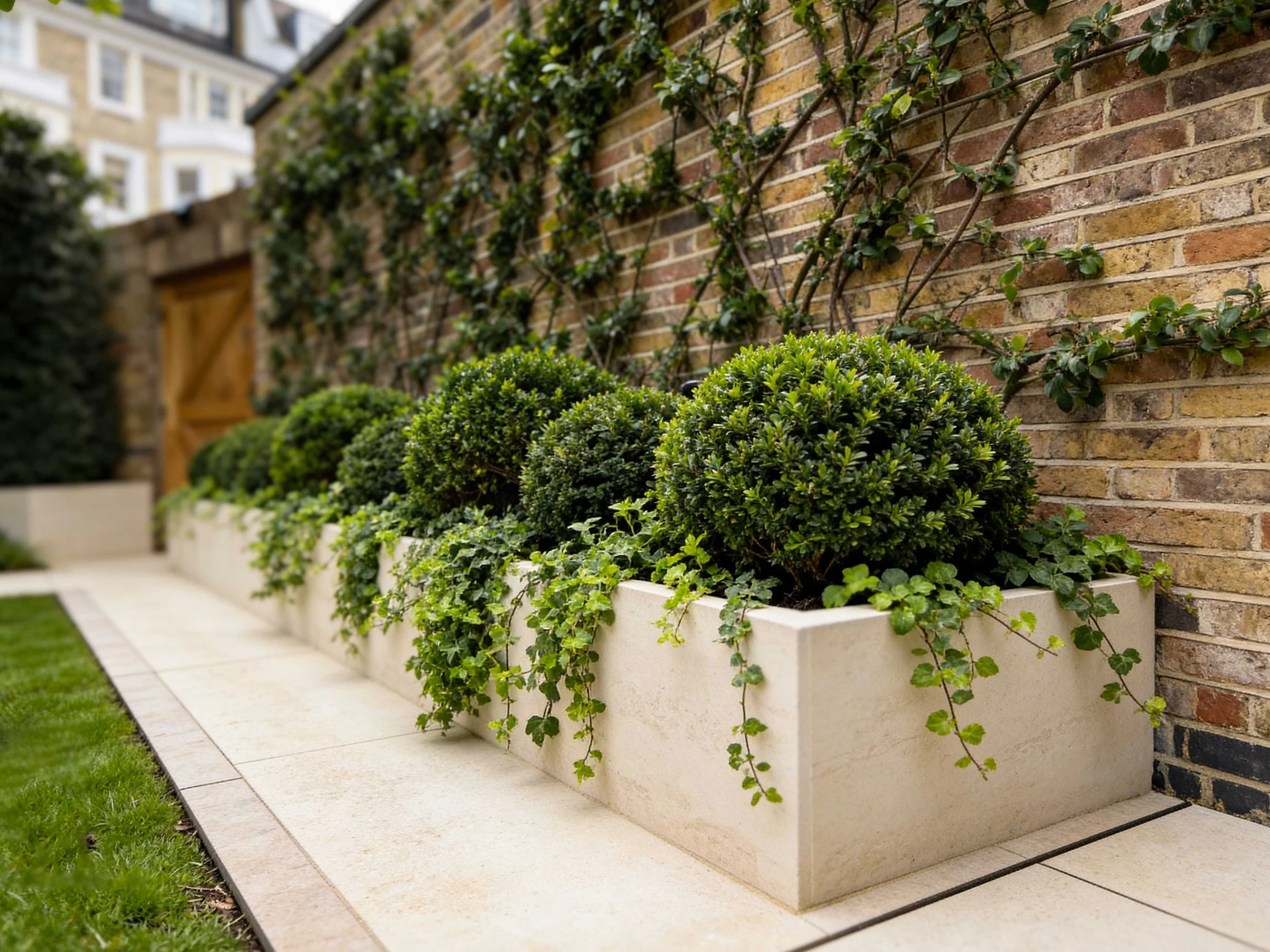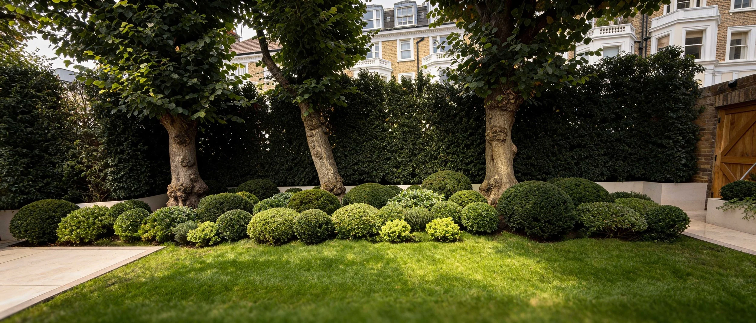 Layered planting softens the transition between lawn and boundaries, while trained climbers and dense hedging provide a refined sense of enclosure.