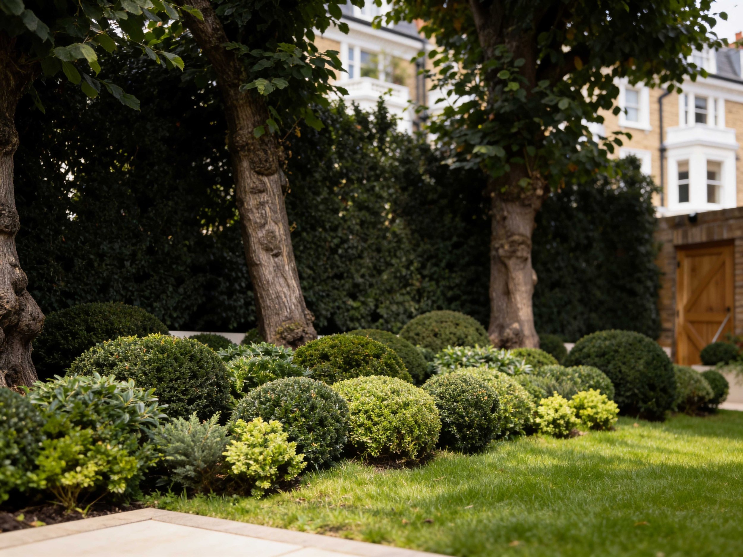 This garden is composed around a series of sculptural, clipped evergreen forms set beneath mature trees, creating a calm and intimate atmosphere.