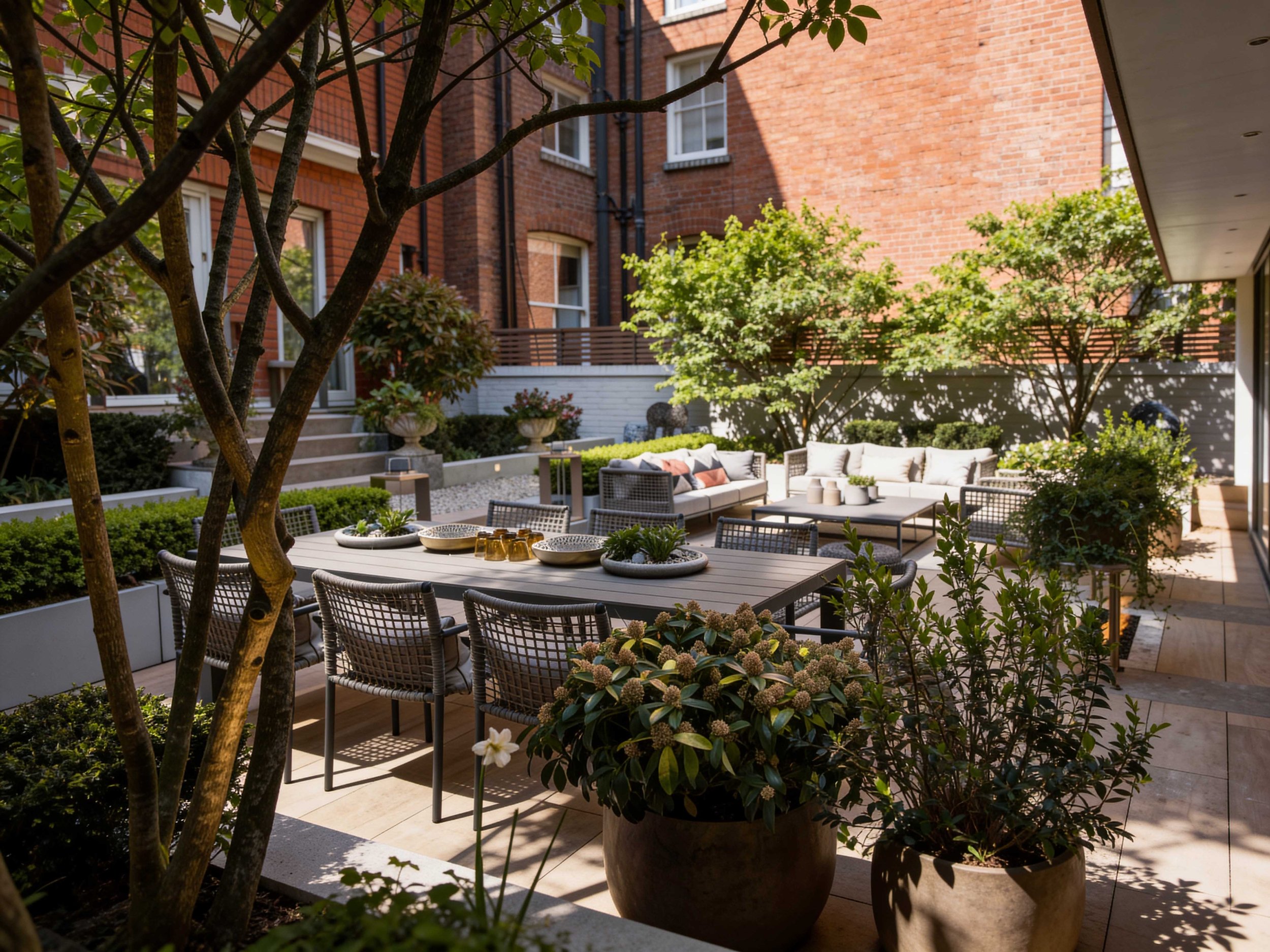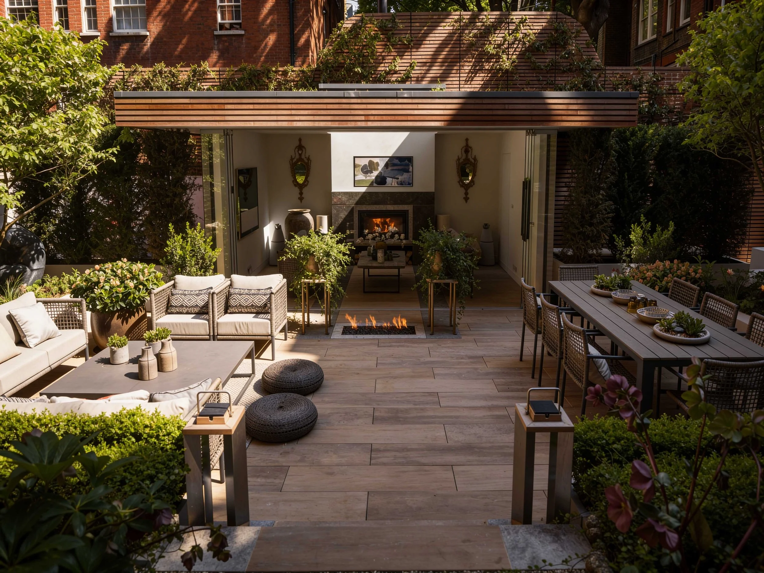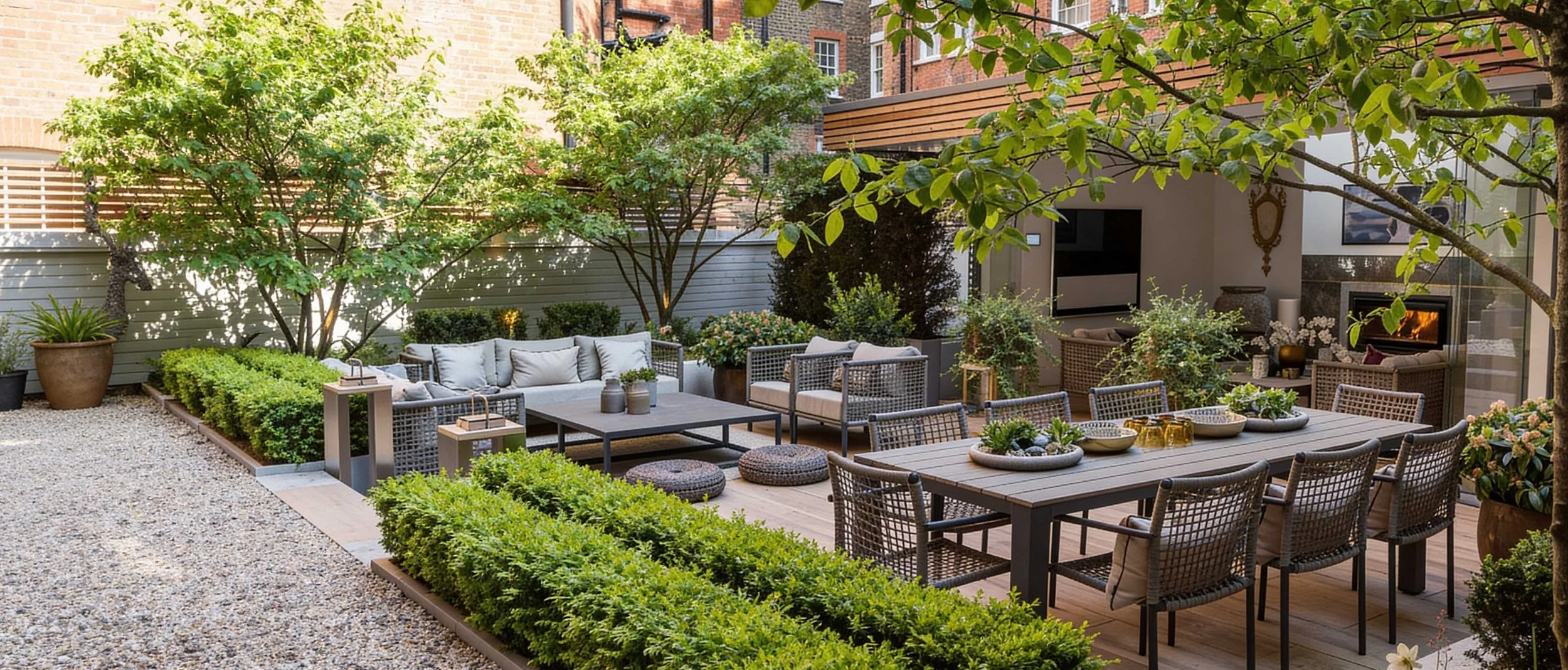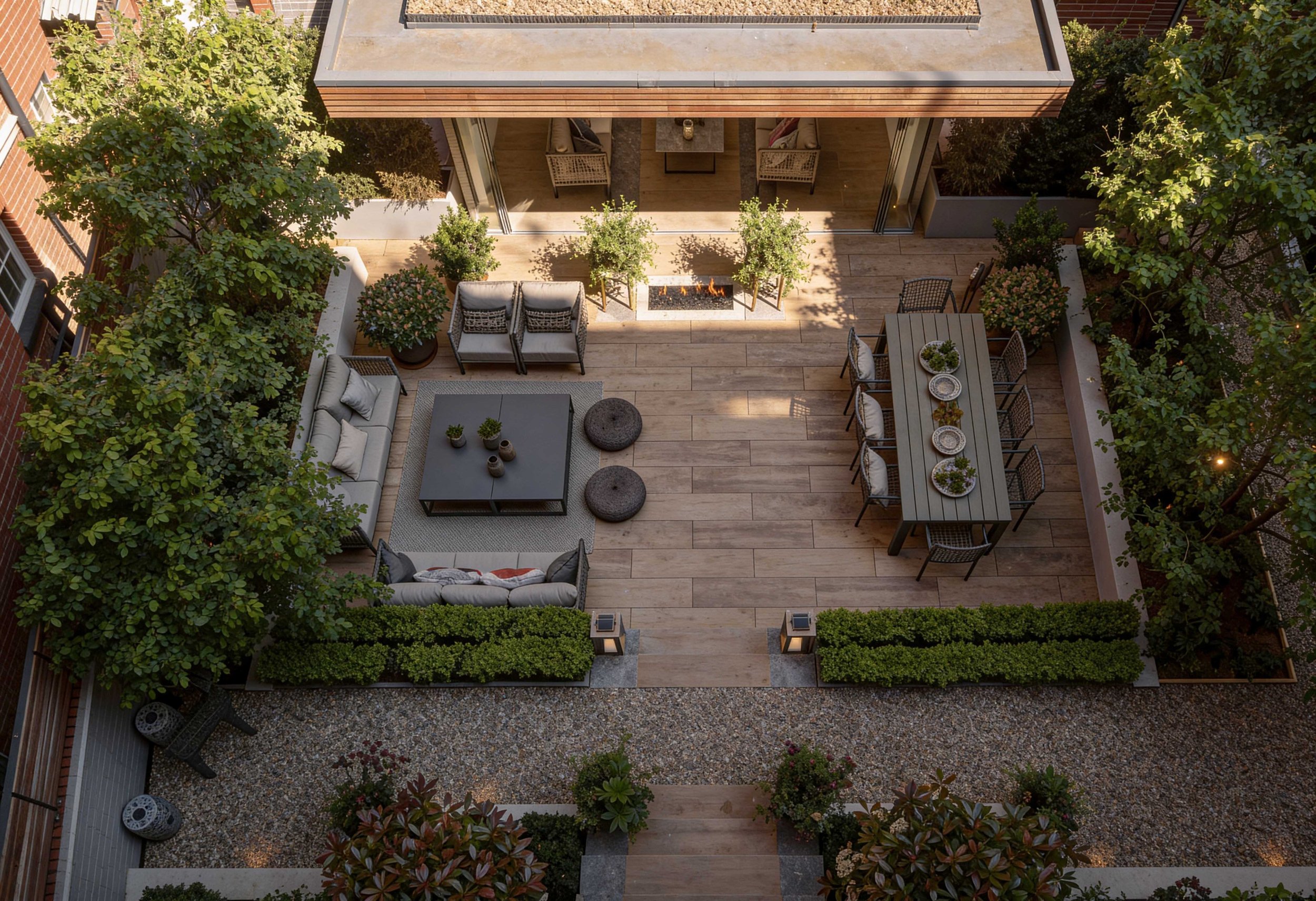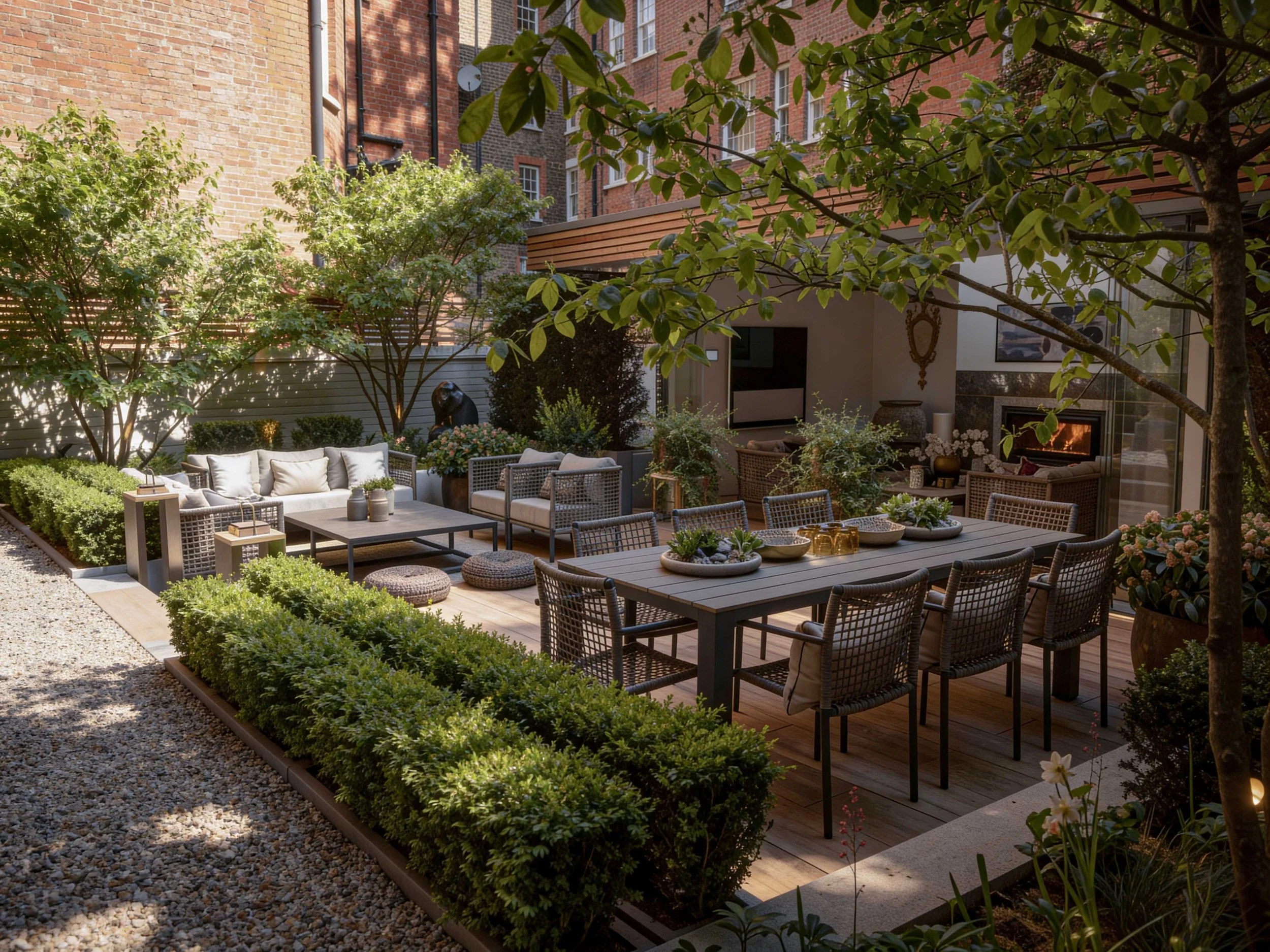 The Courtyard gardens at this stunning property in the heart of Chelsea links the main residence with a glorious outdoor room complete with lounge, kitchen and service area. Multi-stemmed trees provided privacy from its neighbours allowing the clients to dine and relax in the lounge area in more comfort. A little glamour and drama was introduced with a concealed roaring fire-pit under the paving. Structured planting and clipped hedging frame the space, softening the surrounding hard landscape. A generous terrace creates a relaxed setting for outdoor dining and everyday use.